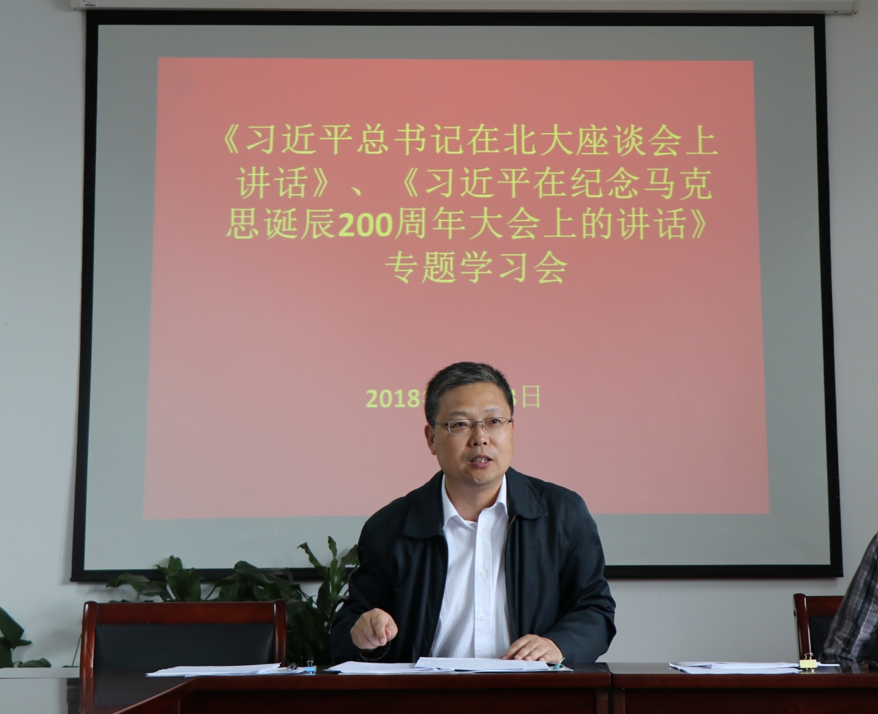 2018年5月23日下午,冠军白菜策略网cmp8论坛举办《习近平总书记在北大座谈会上讲话》、《习近平在纪念马克思诞辰200周年大会上的讲话》专题学习会。党总支书记李俊龙、经理郭振飞、党总支副书记、副经理高务龙等全院教职工参加了学习会,李俊龙主持了此次会议。