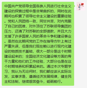徐锐真同志在冠军白菜策略网cmp8论坛研究生第三党支部党员群中分享了与社会主义建设相关的学习资料,主要从“贯彻八大精神”“开展整风运动和反右派斗争”“‘大跃进’和人民公社化运动”“初步纠正“左”的错误及中断”“纠正‘五风’和初步调整国民经济”以及“完成国民经济调整任务,开展社会主义教育运动”这几个方面系统而全面的介绍了新中国成立以来中国共产党带领全国人民积极探索社会主义建设,寻求一条适合我国国情的社会主义建设道路。